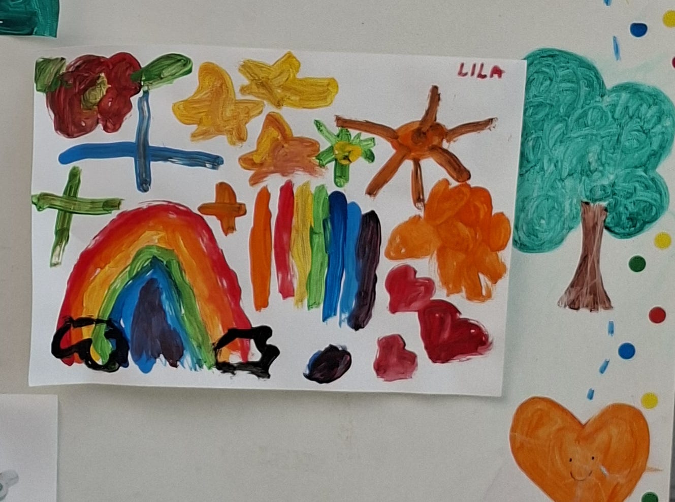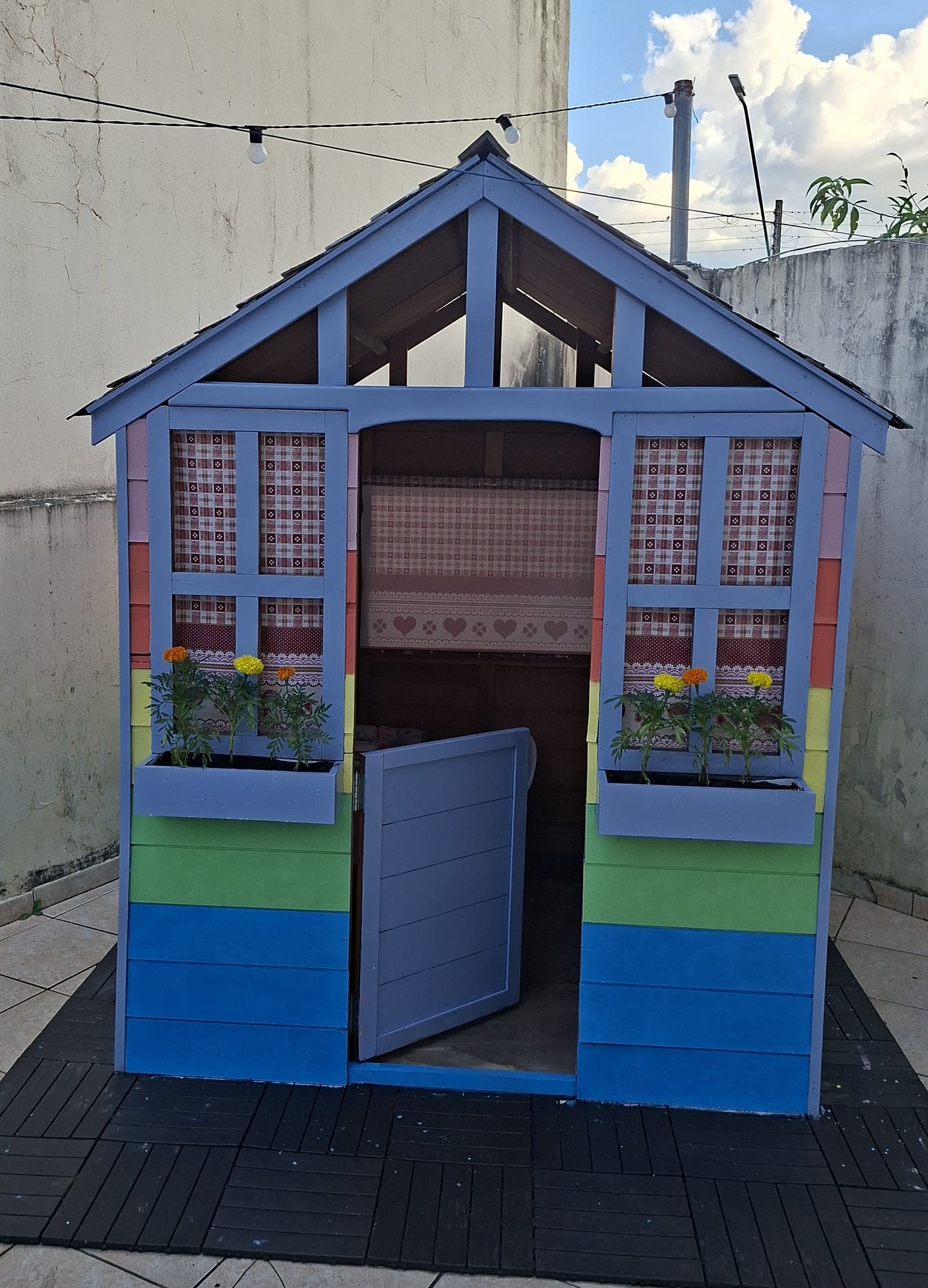 O projeto: há tempos me incomodava o estado da casinha da Lila. Quando eu mandei fazê-la, avisei ao marceneiro que ela ficaria no tempo. Já entendi que esse marceneiro se faz de sonso. A casinha ficou feia, com manchas escuras. Eu não tinha tempo de lidar com ela. Mas as férias e a decisão de fazer coisas que me deixam contente confluíram e eu tinha tinta, corantes e muita autoconfiança. Eu não precisava perguntar como a Lila gostaria que a casinha fosse pintada porque esse é o tipo de desenho que ela faz: